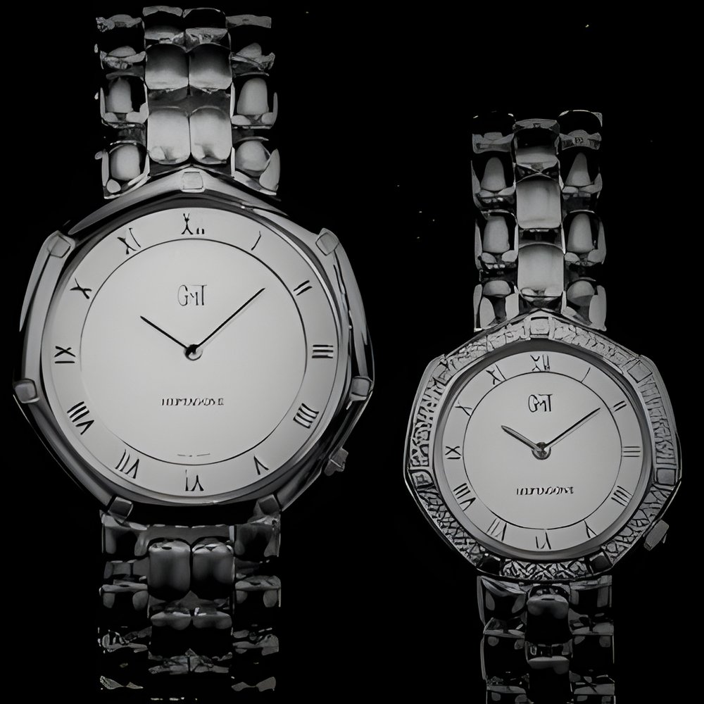 The “Heptagone Dress” models from GMT Gold Collection. Seven-sided 18K gold cases, water-resistant but ultra-slim, 18K gold Roman numerals on white matt dials. The bezel of the ladies’ version is set with round diamonds. Gold bracelets. (GMT Gold Collection “Heptagone Dress”)
