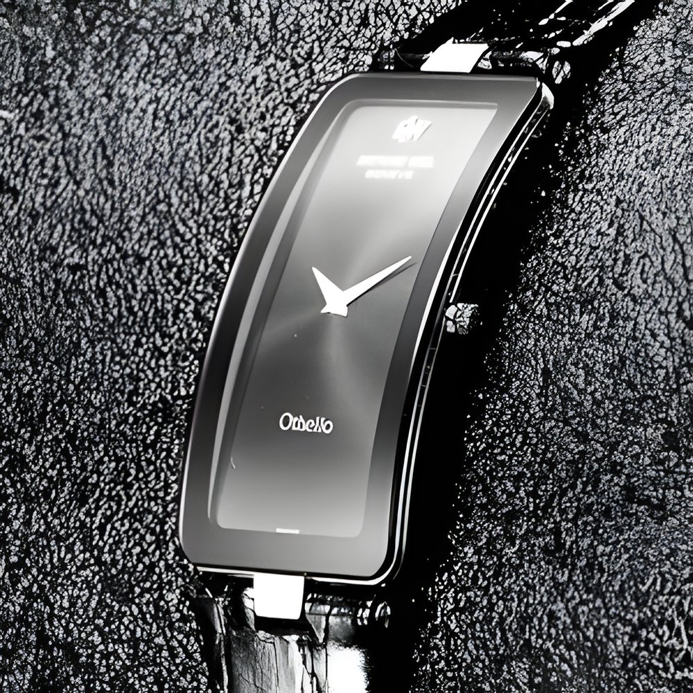 Raymond Weil’s “Othello” collection includes the novel silhouette of a rectangular case, elongated and curved to match the wrist’s contours, yet water-resistant down to 30 m. It is clad either in black titanium nitride or goldplated. Premium-quality quartz movement, only 1.2 mm thick. Black crocodile strap. (RAYMOND WEIL “Othello”)