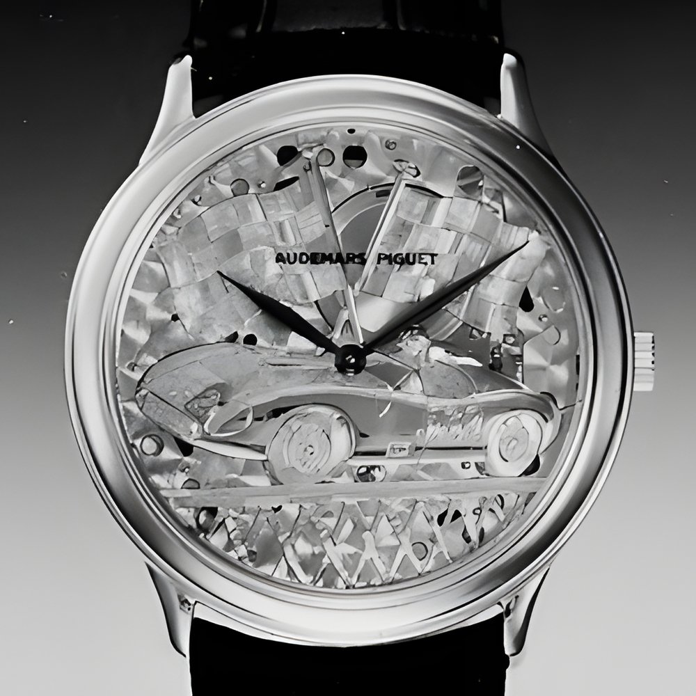A new model joins Audemars Piguet’s “Vintage” collection that made its debut at last autumn’s “Montres et Bijoux Genève” show. Entirely chased by hand, its 18K gold dial recalls one of the all-time classics of automotive history while revealing part of the ultra-thin selfwinding movement with circle-grain decor underneath, also visible through the gold case’s transparent back. (AUDEMARS PIGUET)
