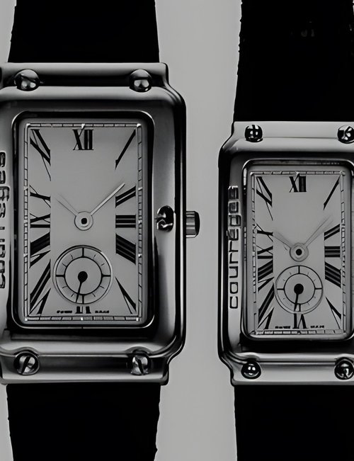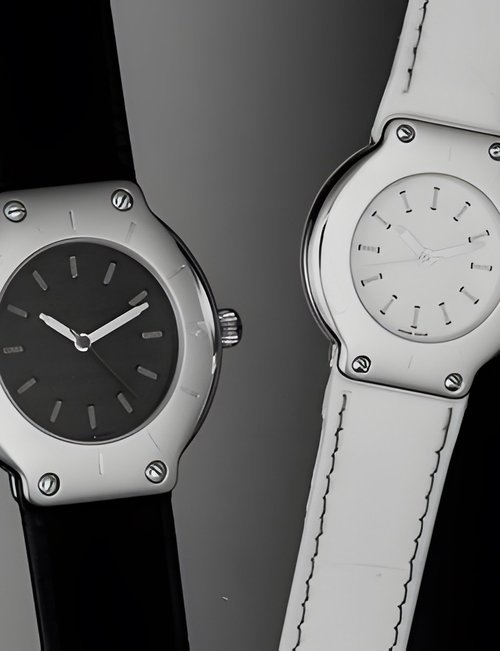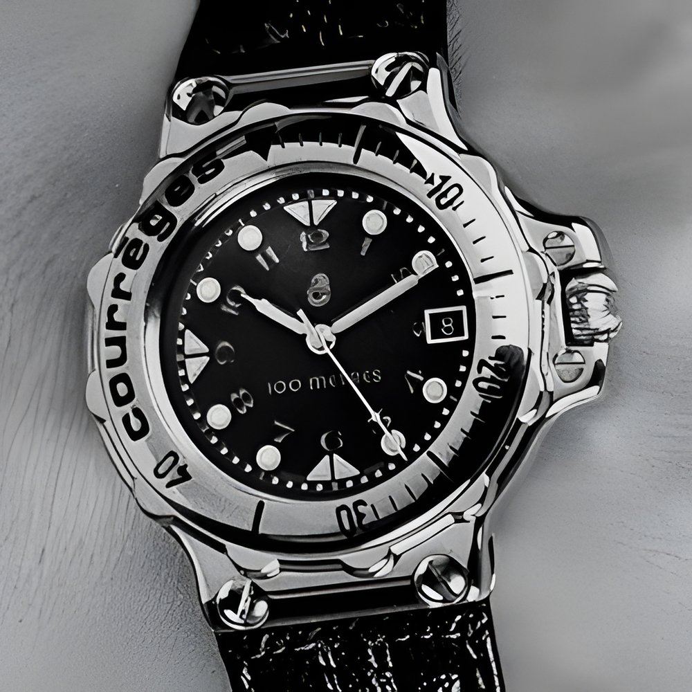 His and Hers divers’ watches, water-resistant to 100 m, from Courrèges. The brand name is inscribed on the bezel and contributes to the model’s stylish good looks. Coldplated cases with screw-locked crown and one-way rotating bezel. (ARODE DISTRIBUTION S.A., Geneva - “COURREGES”)