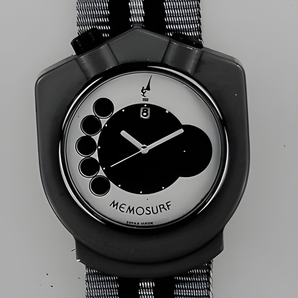 This watch was designed specially for sailboard (or windsurfing) regattas. The 10-minute countdown period prior to the starting guri is clearly indicated by a series of discs that gradually change colour, with the last remaining minute displayed by a special dial at right. The countdown mechanism itself is lodged in a patented subassembly, fitted around the quartz movement, thus reducing the timepiece’s power consumption and the thickness of the multicoloured, fluorescent carbon-fibre case. Waterresistant down to 100 m. Note the very handy position of the pushpieces around the 12-o’clock mark. (MEMOSURF)