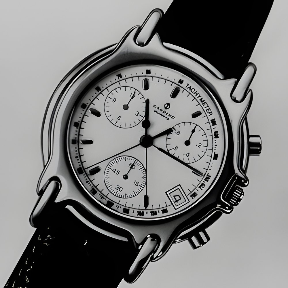 Candino’s new quartz chronograph is a state-of-the-art design with a number of special features. From the centre : hands of the hours, minutes and chronographic seconds along with that of a 60-minute totalizer. Subdials for permanent small seconds, 12-hour totalizer and 1/10th second indicator. Case water-resistant down to 30 m with scratch-resistant sapphire crystal. Patented model. (CANDINO)