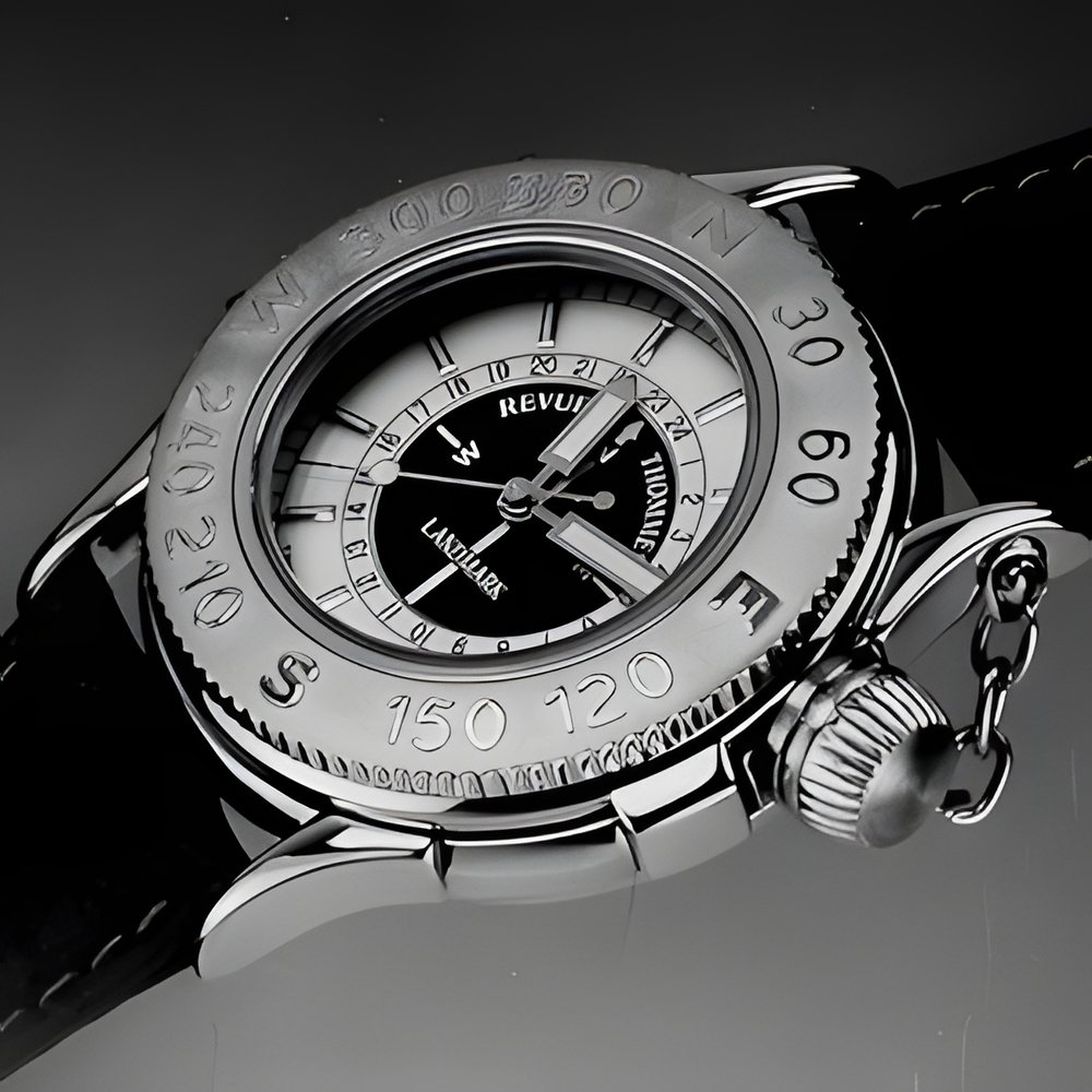 This “Landmark” quartz watch is a Revue Thommen exclusive. It features a centre disc effecting one revolution every 2 hours and a solar compass. Water-resistant to 100 m, this new all-steel design features a protective cover fitted with a one-way rotating bezel and a double case back for thermal insulation. A hood protects the crown. Sapphire crystal. (REVUE THOMMEN)