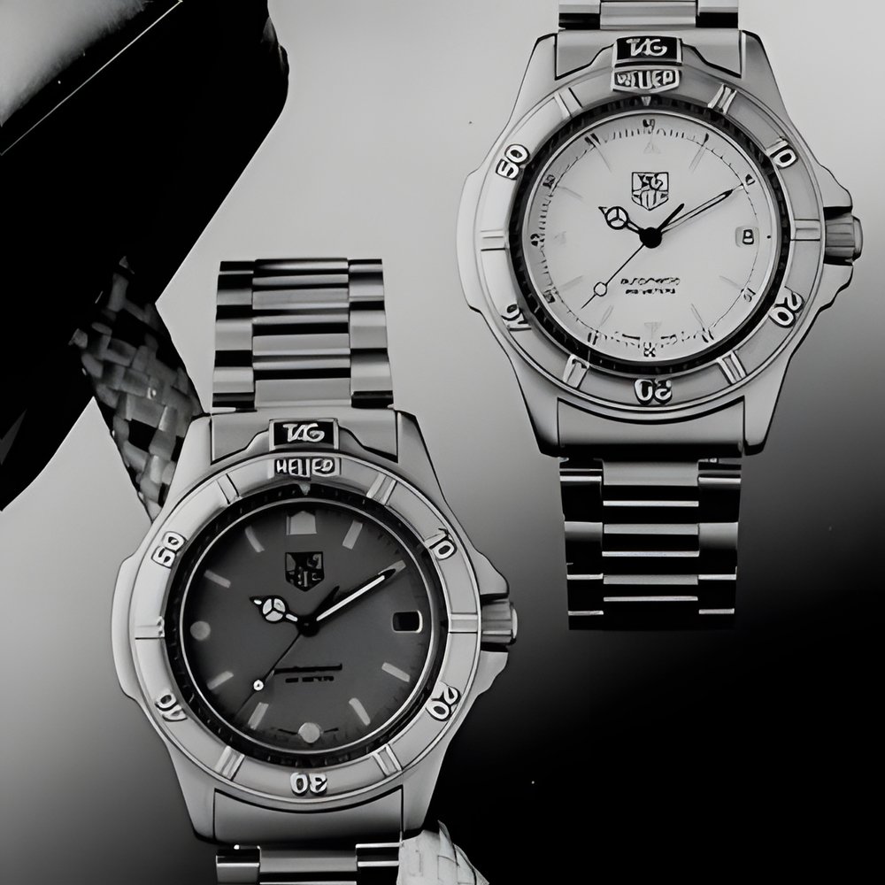 “Serie 4000” is TAG-Heuer’s new product line. Combining the finest technology and tasteful design, it affirms classic good looks in the best I horological tradition serving advanced technological achievements. : Equipped with quartz or seifwinding movements, all “Serie OOO” models are water-resistant down to 200 m, with unidirectional rotating bezel, i sapphire crystal, tritium-painted hour markers and bracelet with double safety clasp. (TAG-HEUER “Serie 4000”)