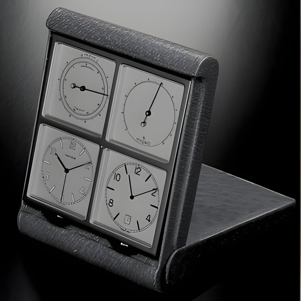 Compact travel clock in yellow goidpiated brass. Case with foldinq prop, sheathed in pigskin, lizard or crocodile. Its four dials show local time (with date calendar), time in another timezone, room temperature (thermometer) and ambient humidity (hygrometer). Quartz movements, one with alarm system. (LUXOR)