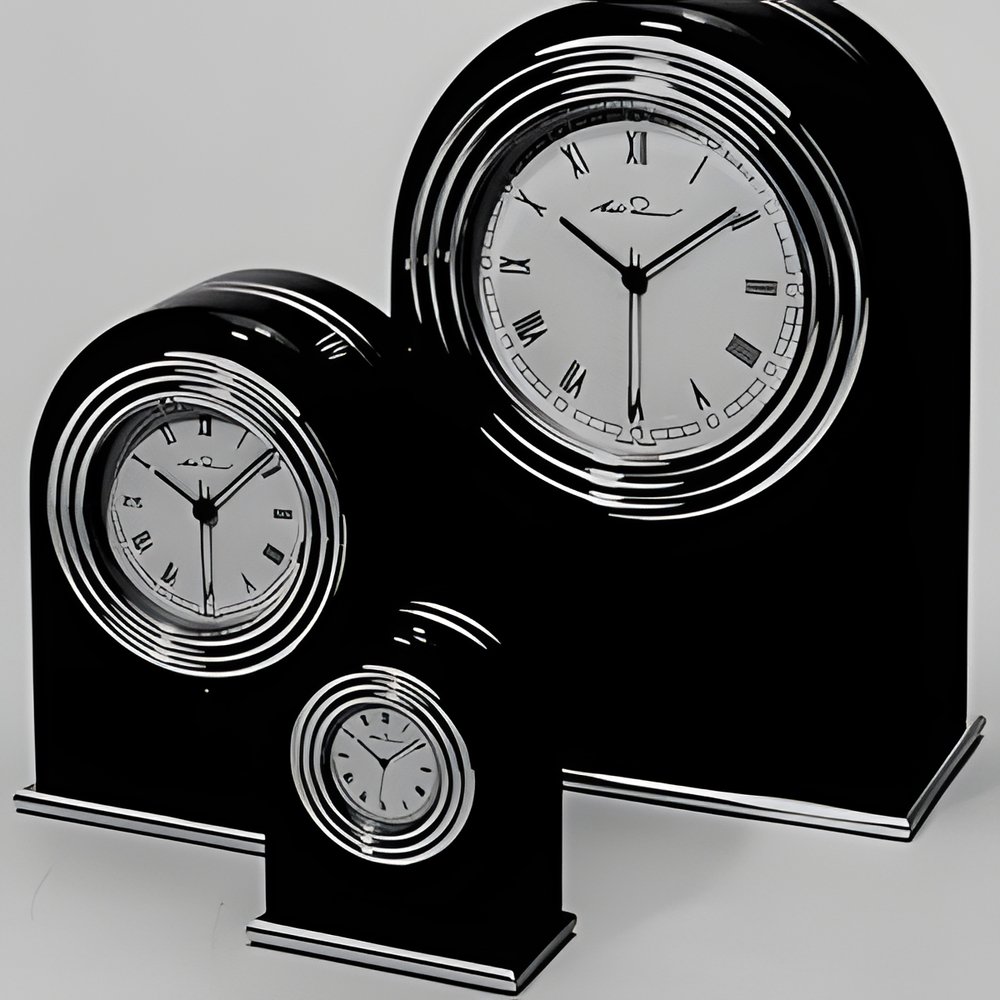 Michel Perrenoud, ’the virtuoso of wood creations", presents a line of humpback clocks carved from solid mahogany or rosewood, with glossy finish. Baseplate and dial frame in polished brass. Swiss-made quartz movement, with or without alarm device. (Michel Perrenoud, SETCO, La Chaux-de-Fonds)