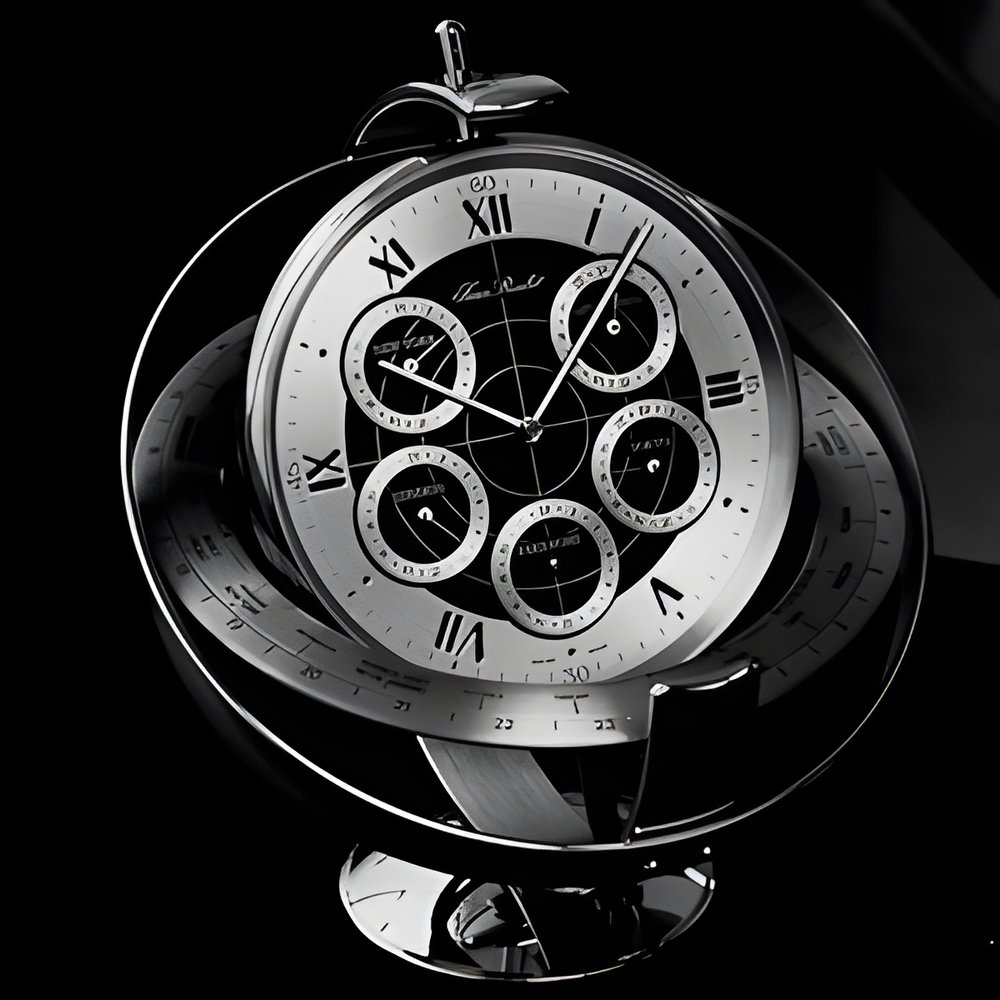 Mantel or desk clock with entirely hand-made brass case covered in white gold. The time in 5 different time-zones appears on its black dial. A manually rotated ring provides universal time. Its quartz movement is designed to show the hour, minute, day, month, date and phases of the moon. (JEAN ROULET "Saturne’)