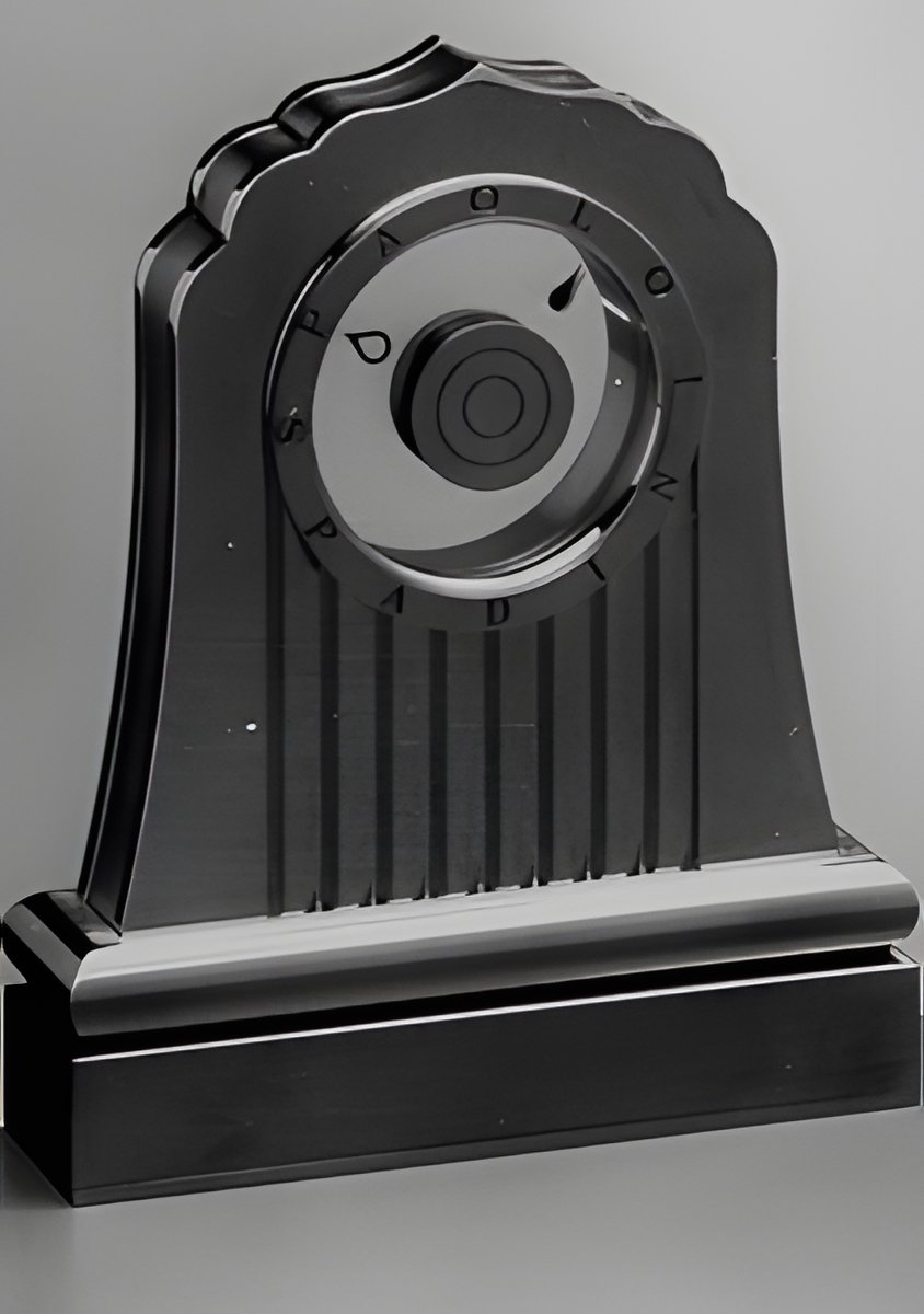 A door of Kyoto’s Ryoangi temple inspired Paulo Spadini to design this mystery clock with neither setting button nor hands. It shows the time by means of transparent discs and is set simply by pressing on the crystal. (SPADINI “Kyoto”)