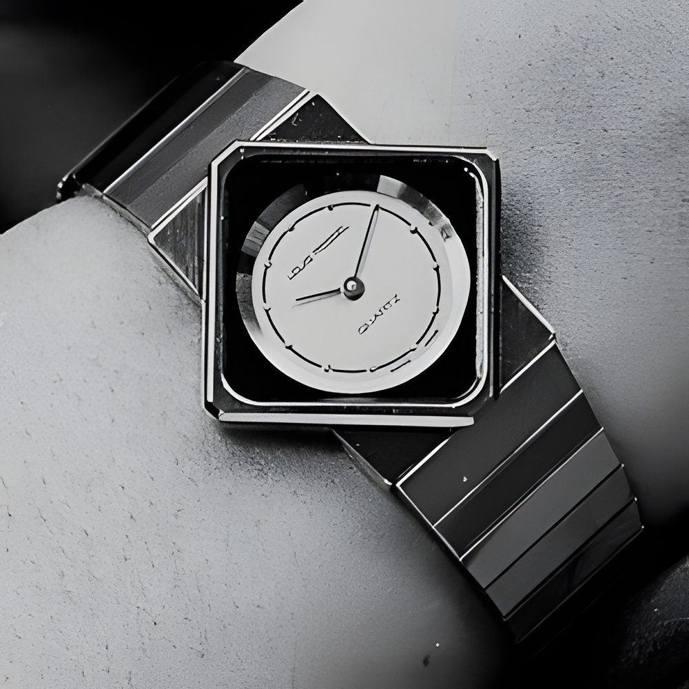 European Watch Clock and Jewellery Fair 1982 BF 1009Q. A particularly interesting new design: the mineral crystal covering the entire case surface is metallised in black around the dial to accentuate the watch’s unusual lozenge shape. Goldplated, perfect integration of bracelet to case, water-resistant to 30 m, compact quartz movement. (HOME WATCH - LOUIS ROSSEL)
