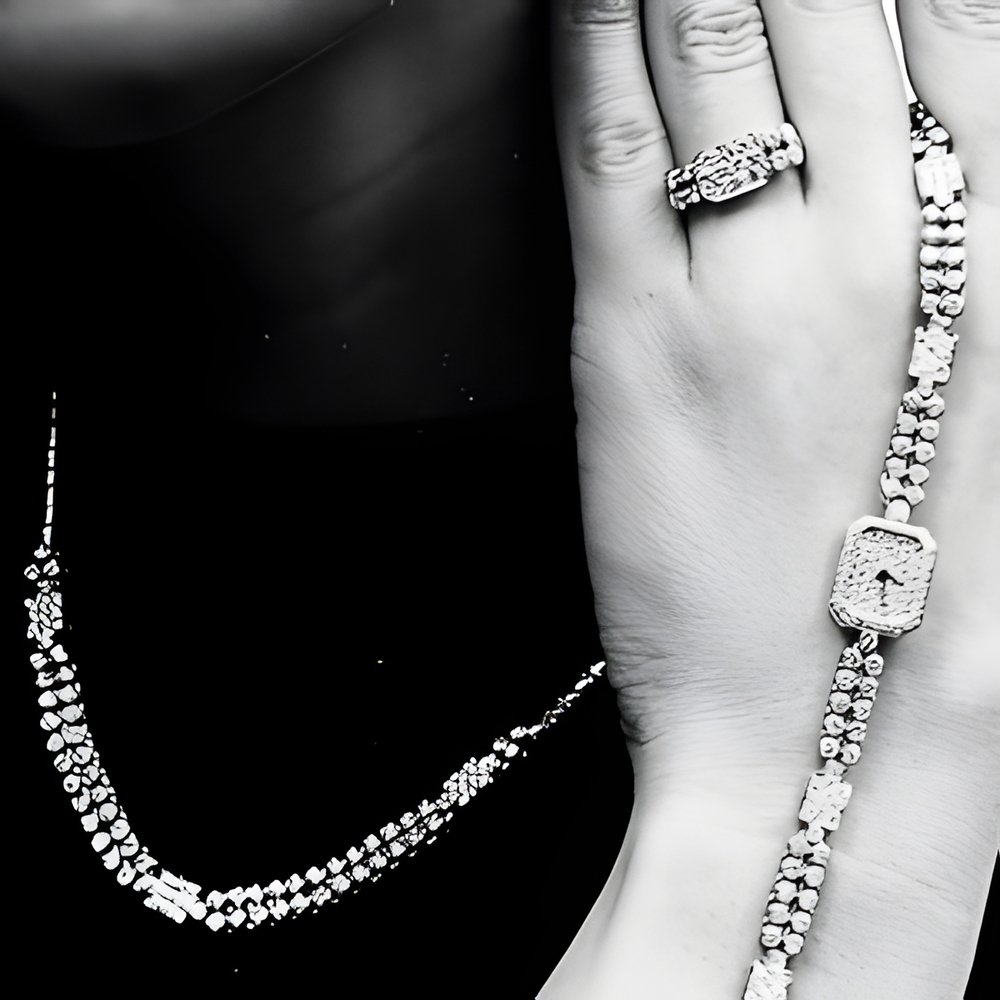 Two-tone luxury jewellery set from Chopard of Geneva. The braceletwatch is composed of alternating segments of white gold with flush-set diamonds and diamond pavés mounted in yellow gold. The ring and bracelet are similarly styled and the watch dial itself is entirely diamond-cobbled. (CHOPARD, Geneva)