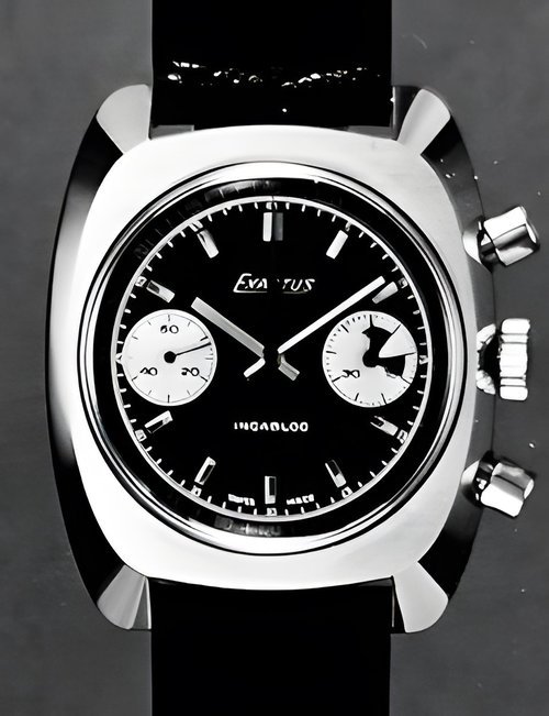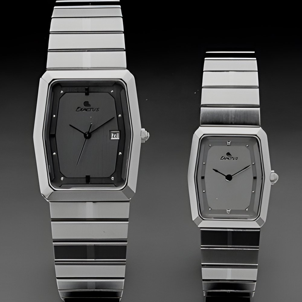 Two extra-thin models from the Exactus collection designed by Lucien Daguette. Water-resistant cases, [ta Swiss Quartz movement, two-tone styling. Dark or light coloured dials, steel and gold or steel and goldplate. (EXACTUS)
