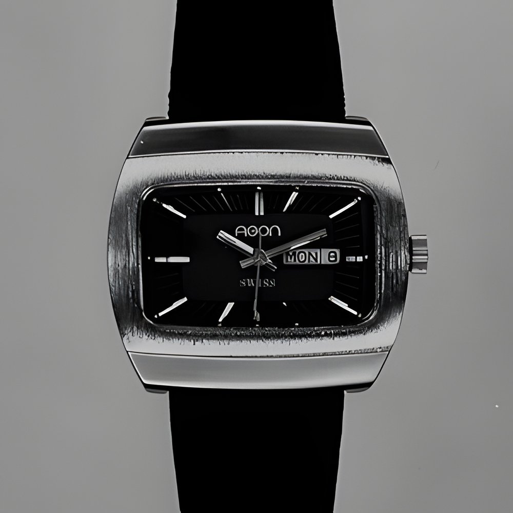 Daring in size and lines, here is a definitely masculine model. The transversally positioned case fits comfortably on the wrist Tvo-tone dial, day and date calendar. Dust-protection system. (AGON)