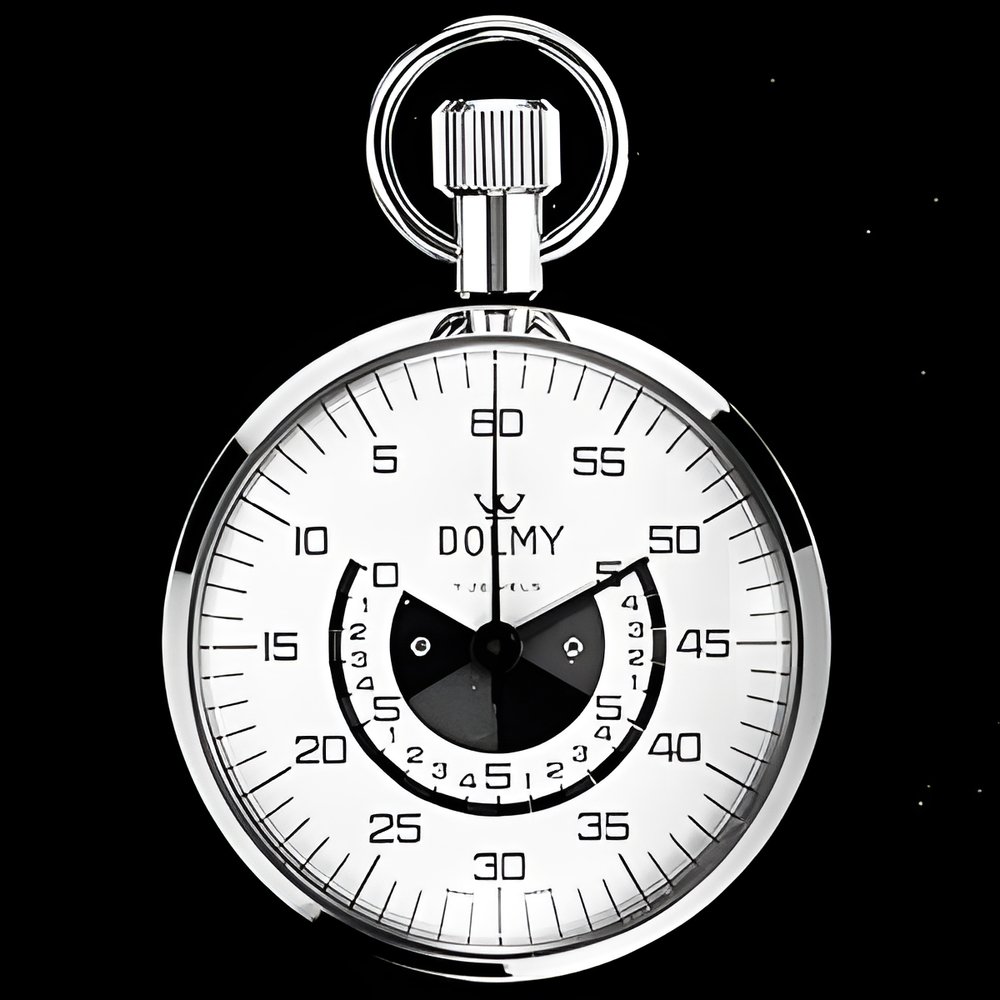 This sports timer boasts a centre minute register divided into various coloured zones for multisport use (yachting, for instance). All timing operations are effected by the crown. 7-jewel pin-lever “inexpensive” movement with shock-protection system. (DOLMY)
