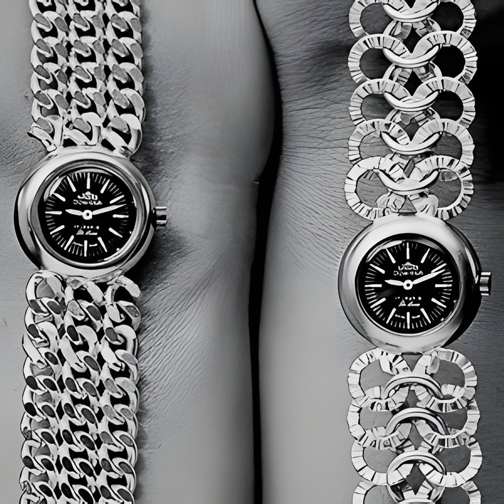 Economical watches are perfectly in tune with present-day sartorial fashions. Here are two models with a bracelet fashioned of large multiple-strand chains In gilt metal, coloured dial. (JOWISSA)