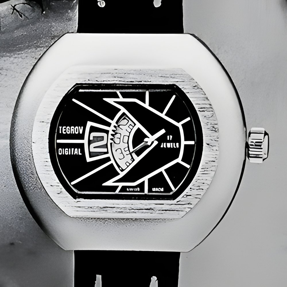 One of many digital watches on display in Basle this year. Only the seconds hand remains. Hours and minutes appear in wide apertures. Large chromed case. (SCHAUB-TEGROV “Digital”)