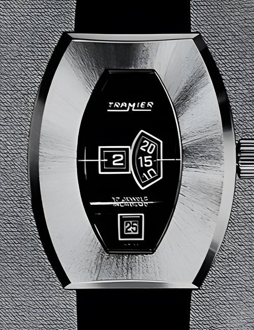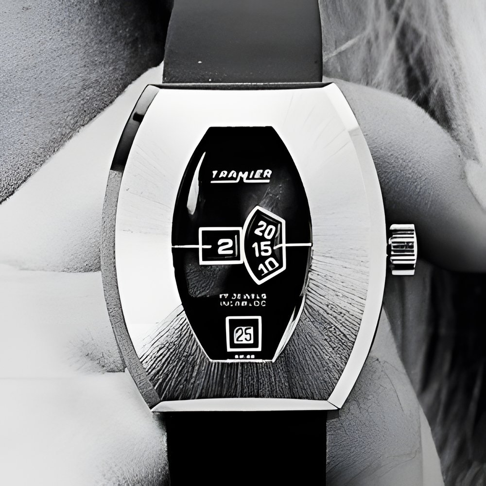 The “digital watch” - one of the hits of the 1972 Swiss Watch Fair. The hands are replaced by figures appearing in apertures in the dial. With calendar. Chromed case, water-resistant to 5 atmospheres. 21 ,600 v.p.h. lever movement. (TRAMIER)