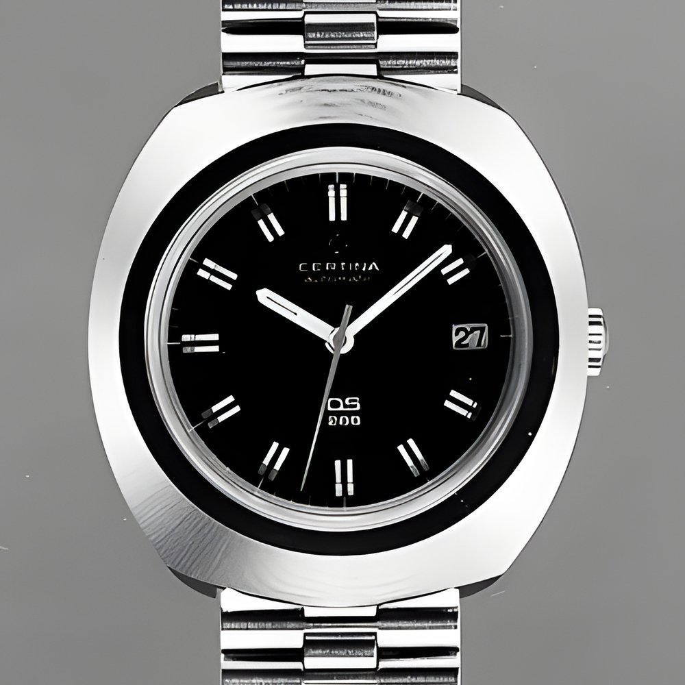 A townwear and sportswear watch with “security” as its theme. The movement is protected by a twin shock-protection system and an all-steel case - with screwed-down crown - waterresistant to a depth of 200 metres. The “glass is actually an absolutely scratchproof sapphire crystal. For rate accuracy, this model incorporates a”high frequency" movement (28,800 v.ph0). A new Certina design in the 288 series. (CERTINA Super DS 288)