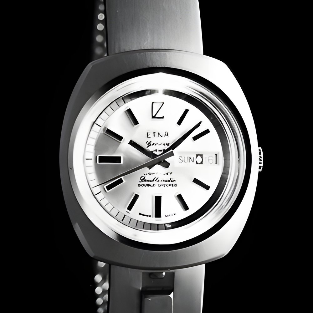 This watch incorporates its own light source; it not only serves to light the dial but, with its powerful beam, for map reading, finding keyholes and so forth. A tiny bulb is lodged in the case in such a way that its light illuminates the entire dial. The power source is constituted by twinned 1.5 V batteries hidden under the bracelet links. This model is available in various versions: selfwinding, ladies model, chronograph or alarm watch (ETNA “Light Jet”)