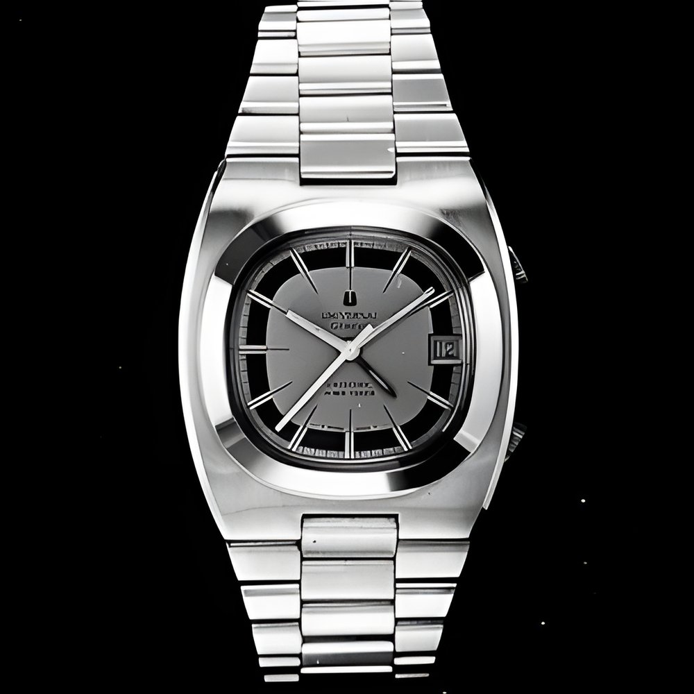 A ttechnicaU’ watch with tuning-fork electronic movement. An extra hand shows the time in another time zone. If the main hand shows Paris time for instance the other will give New York, Tokyo or London time, as the wearer tJshes. It can be quickly set to show the time in another time zone without affecting the other hands. Integrated case and bracelet with Full Flow’ styling. Available in 18 ct. yellow gold or stoel, Calendar. (UNIVERSAL Unisonic “Zone-Timer”)