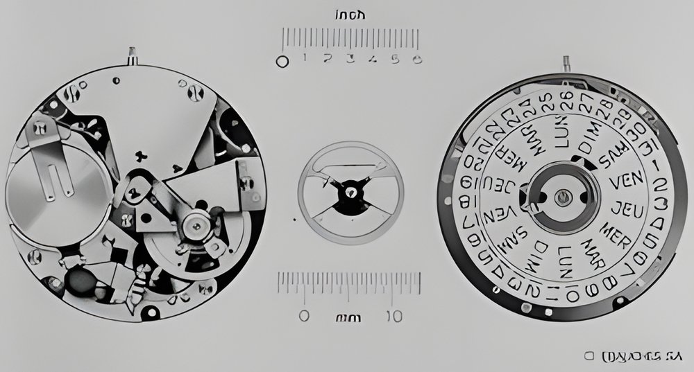 Balance wheel movement for men’s watch, Day-Date, Frequency: 4 cycles/s.