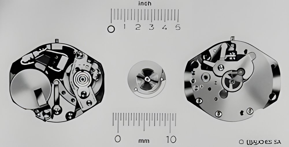 Balance wheel movement for ladi&s watch, Intergrated circuit. Frequency: 4 cycles/s. The world’s smallest electronic watch movement