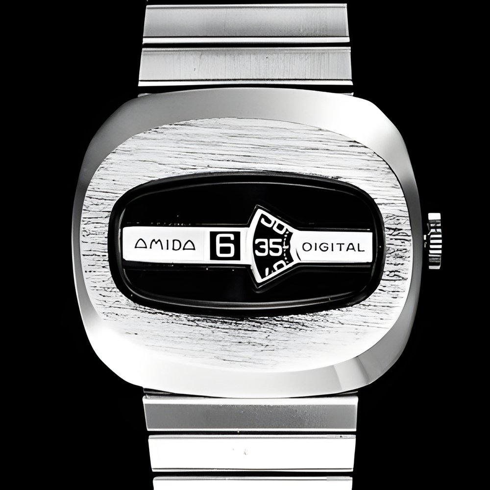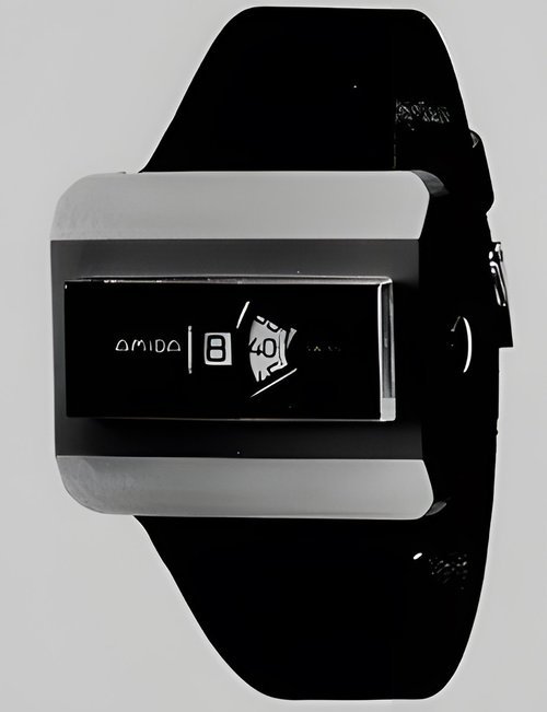The outstanding f eature of this mechanical, digital display model is the perfectly central position of the hour and minute apertures on the dial. Very modern oblong case with gracefully rounded angles (AMIDA - patented, registered model)