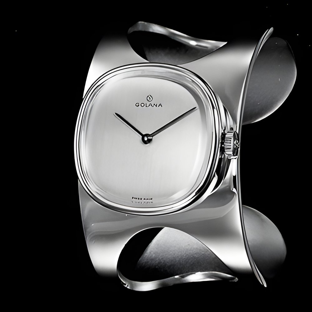 Silver watches are very popular with younger consumers. This model has a wide rigid bracelet with two large apertures. The silvered dial is also generously proportioned and devoid of hour numerals (GOLANA)
