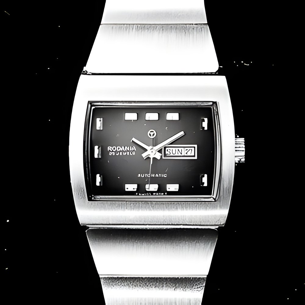 Ladies automatic models are enjoying increased favour with every passing year. This watch is typical of the “Full Flow” line: a broad-segment metal bracelet fits smoothly against the slightly rounded water-resistant case. Day and date calendar, coloured dial. (RODANIA)