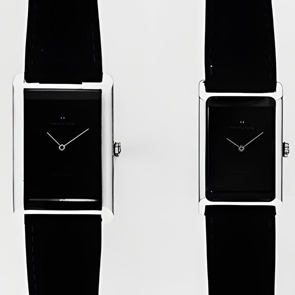 Two models from Hamilton’s new “Couturier”line. They form a pair, similar except for size. Yellow or white goldplate, mirrorpolished dial plate, quartz-coloured crystal. (HAMILTON “Couturier”)
