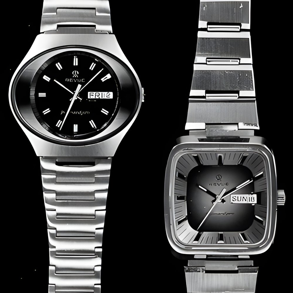 Here are two new automatic models with day and date calendar, all-steel water-resistant cases with a mineral crystal. Integrated steel bracelet. (REVUE “Kilimandjaro”)