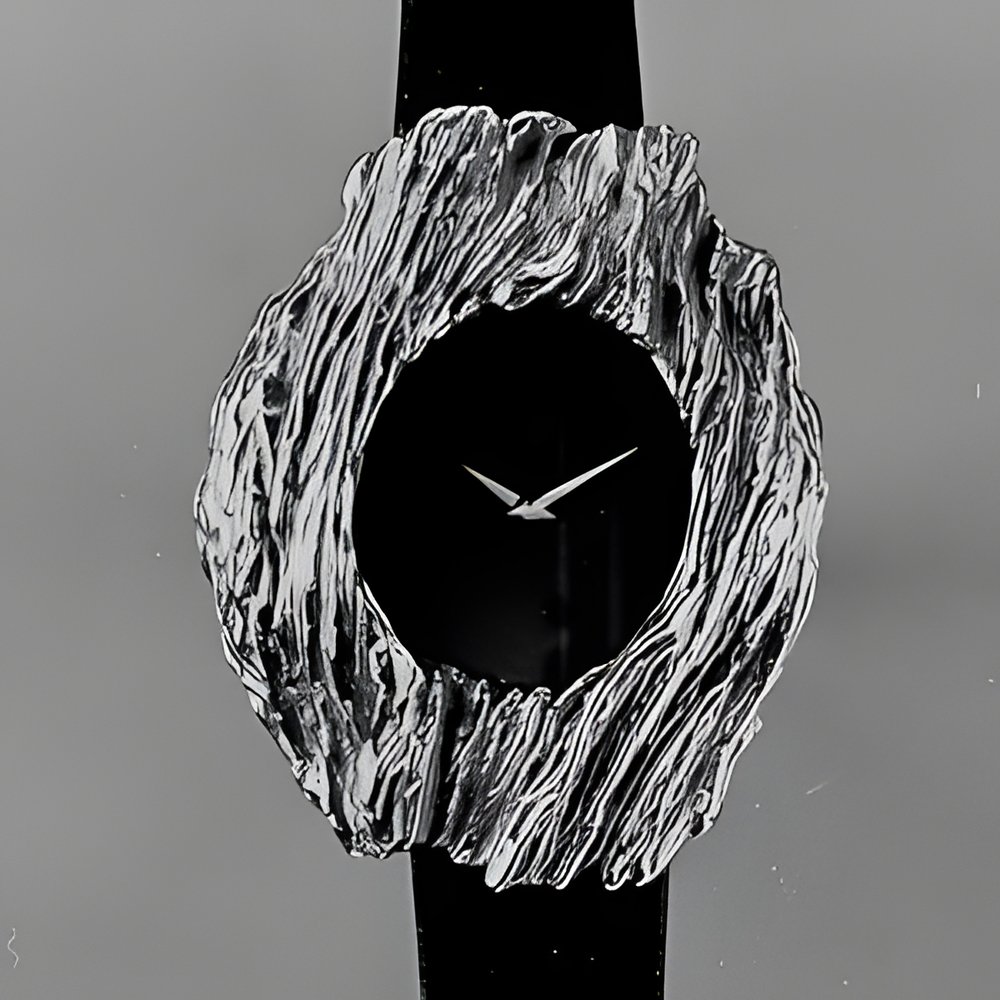 One of the exclusive models designed by Nivia and marketed under the “Farnese” brand. A 18-carat gold superstructure, with broadside engraving, covers the oval-shaped watch. Dial in tiger’s eye lapis lazuli or other gemstone. (NIVIA-FARNESE “Ove Fleuronné”)