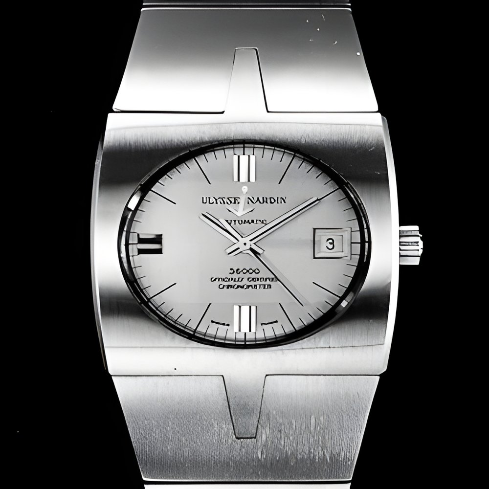 A prestigious model eloquently illustrating the “Full Flat’ line : the bracelet and water-resistant case integrate perfectly. From the case, two rigid and ornamental metal strips ensure perfect fit of the bracelet. High frequency (36,000 v0ph.) automatic movement with”Official Chronometer" certificate. Calendar. (ULYSSE NARDIN)