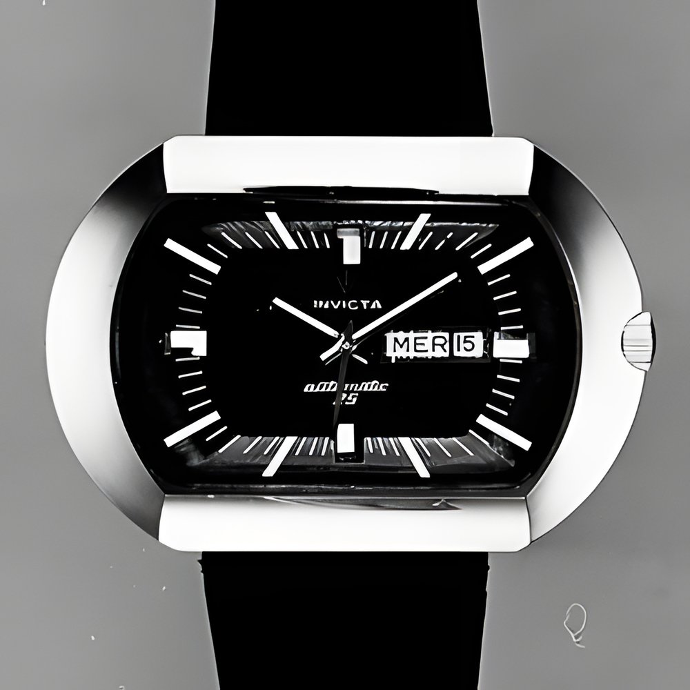 Novel styling for this automatic watch with all-steel case designed to hug the wrist perfectly. Day and date calendar with quick reset system and choice of leather strap or steel bracelet. A similar but smaller model for ladies is available. (INVICTA)