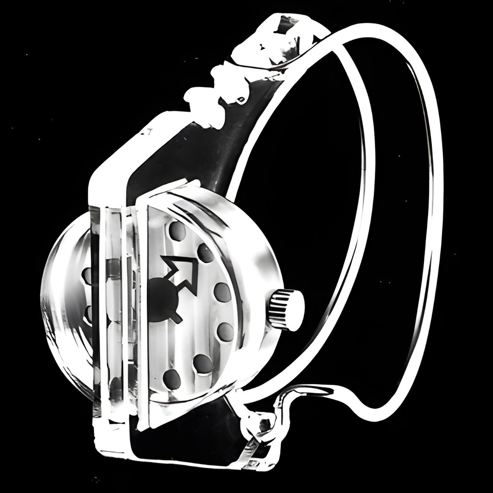A demonstration of the importance which industrial design and synthetics have acquired in watchmaking is this utterly novel model created for Numa Watch, Tramelan. Its steel case is imbedded in a transparent synthetic structure. The steel bracelet hooks into one of the notches (NUMA WATCH)