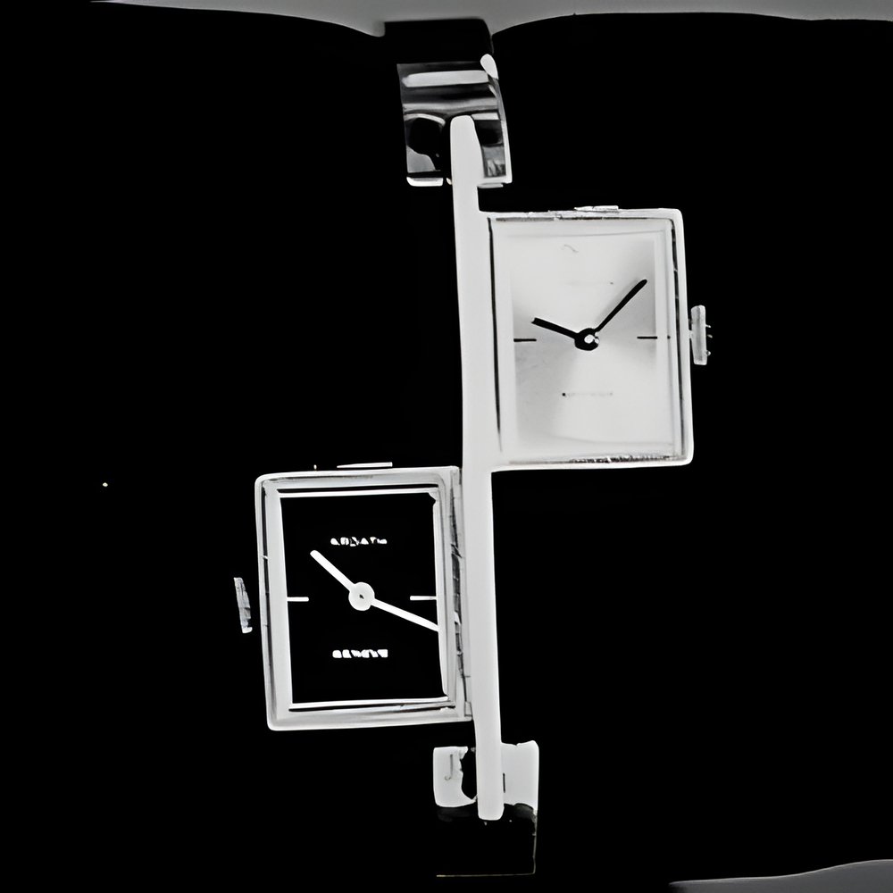 For world travellers, an elegant but most practical ladies watch giving the exact time in two time zones: white dial for local time, black dial for home time. In 0.800 silver. (ARDATH “Hostess Silver Memories”)