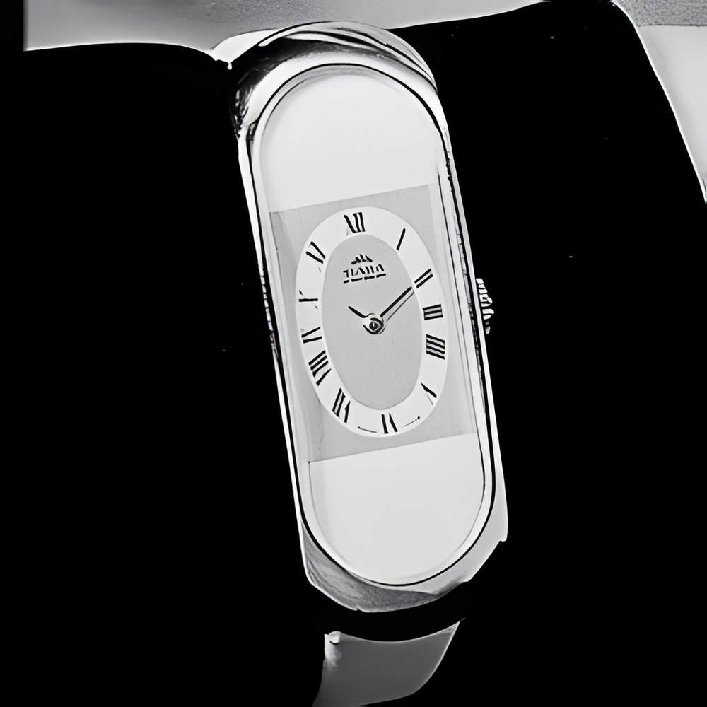 An unusual model. The very long gold-plated case hugs the wrist perfectly. In the center of the dial, the black Roman hours stand out against a silver background. (TIARA)