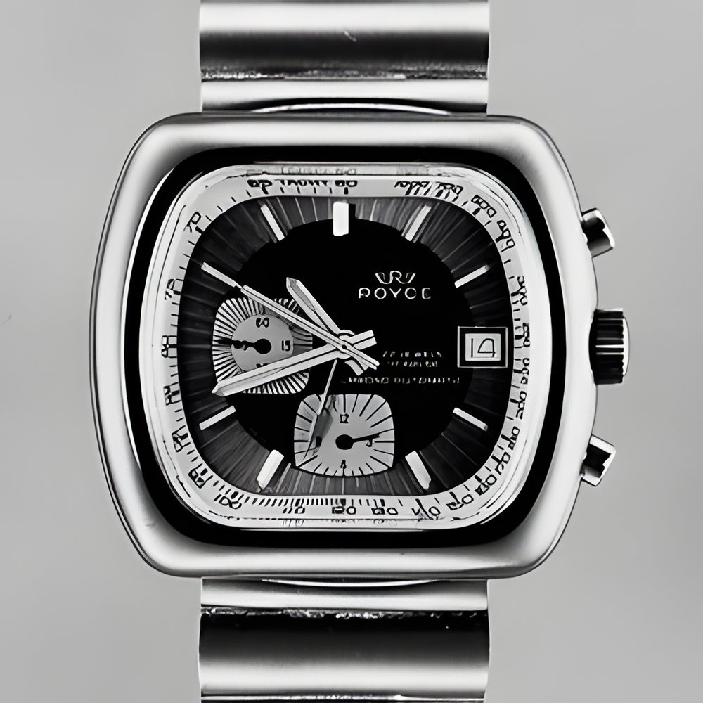 One of the new selfwinding chronometer models unveiled this year in Basle. Precise divisions and colours give the dial greater legibility. With hour and minute totalisers as well as tachymetric scale,. All-steel water-resistant case with modern styling. Calendar. (ROYCE)