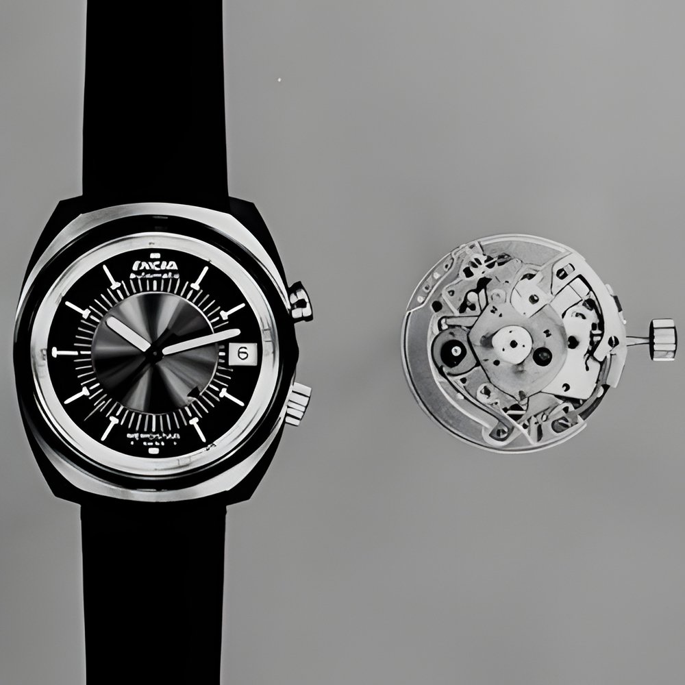 A very timely instrument for modern living - the alarm-watch Here is a new model with automatic movement. A single spring powers both the movement and the alarm mechanism. Limitedduration buzz. Water-resistant case and calendar. (ENICAR “Memostar”)