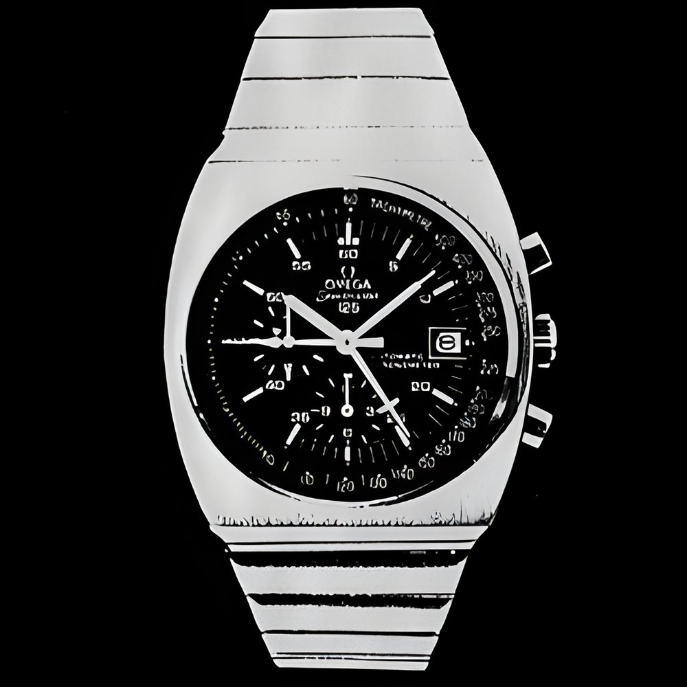 This model as designed by Omega to commemorate the company’s 125th anniversary it is a new, automatic, “Official Chronometers’ version of the famed chronometer which American astronauts wore on the moon. Centre minute totaliser, hour totaliser, 24-hour indicator, tachymeter and calendar. Water-resistant case. (OMEGA”Speedmaster 125")