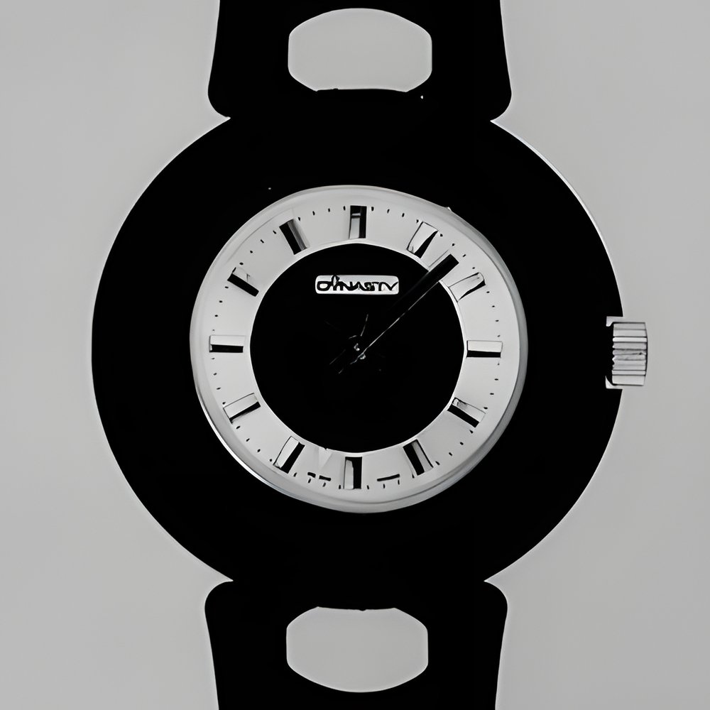 A typical example of the rapidly spreading vogue for watch cases made of synthetic materials. They lend themselves well to new shapes and are ideal for this age of brightly coloured fashions. Here is a man’s model with brown case and brown dial centre on a silvered zone. The synthetic bracelet is also brown. (DYNASTY by ENDURA)