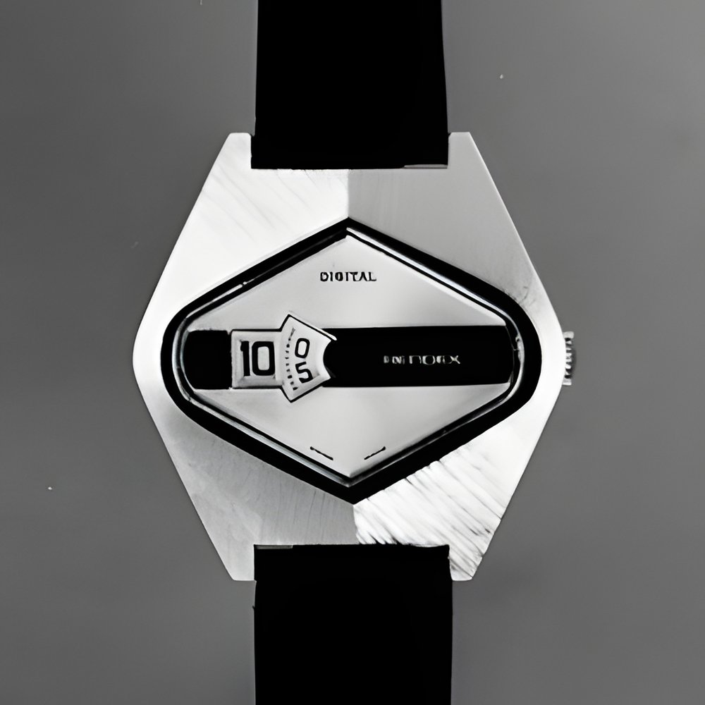 Mechanical digital watches with an economical movement - are very much in demand This styling approach is rich in new and sometimes daring designs like this chromed model with the hour and minute apertures boldly stressed by a broad black stripe. (RENDEX - Digital)