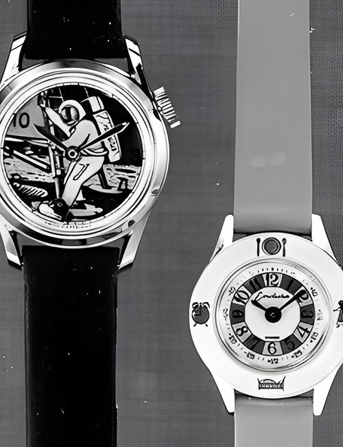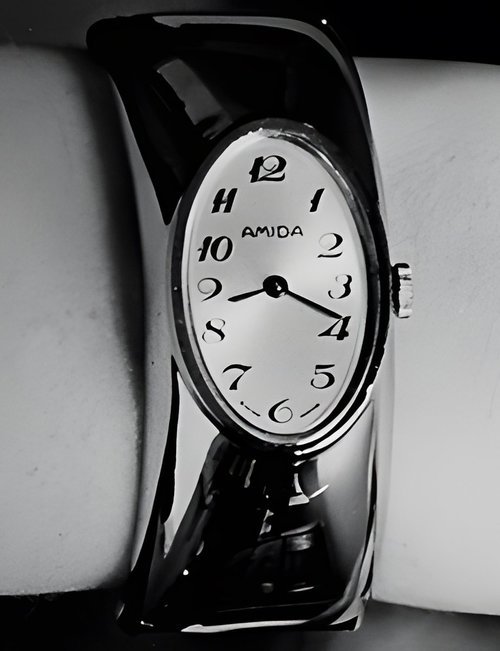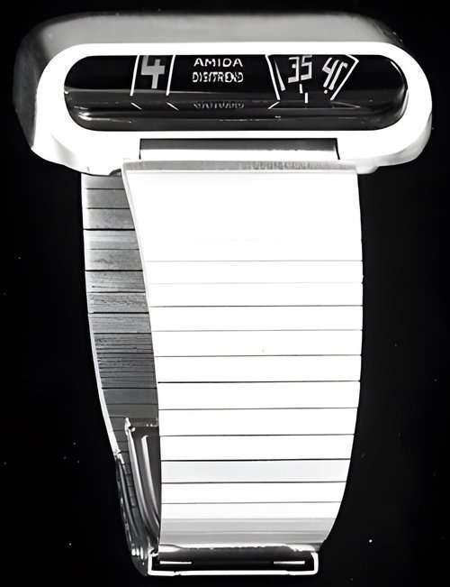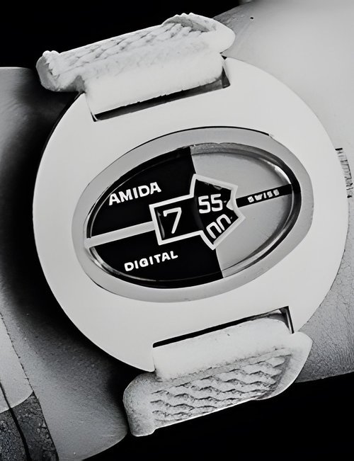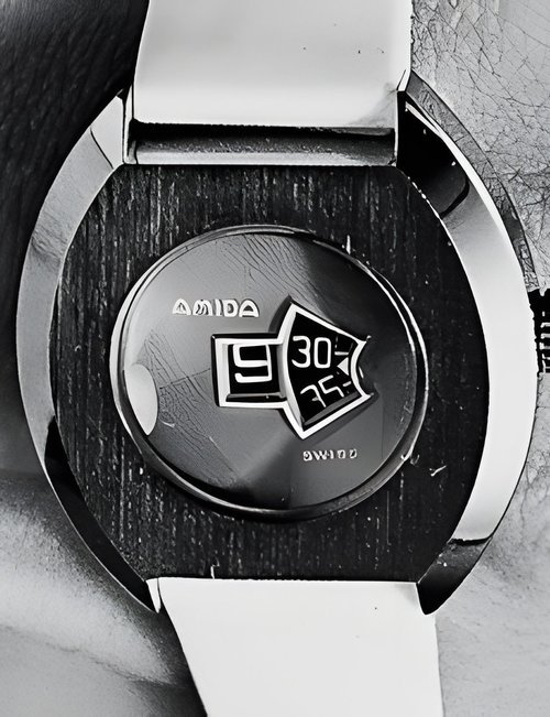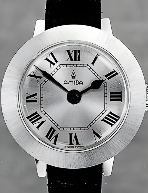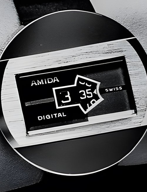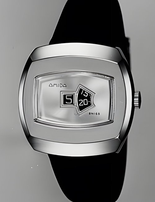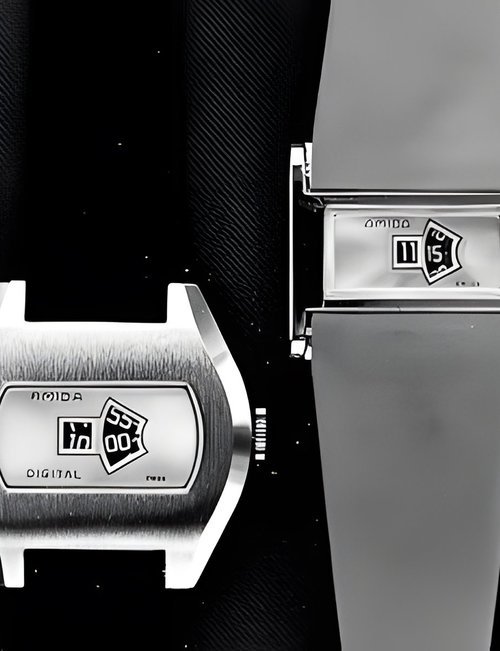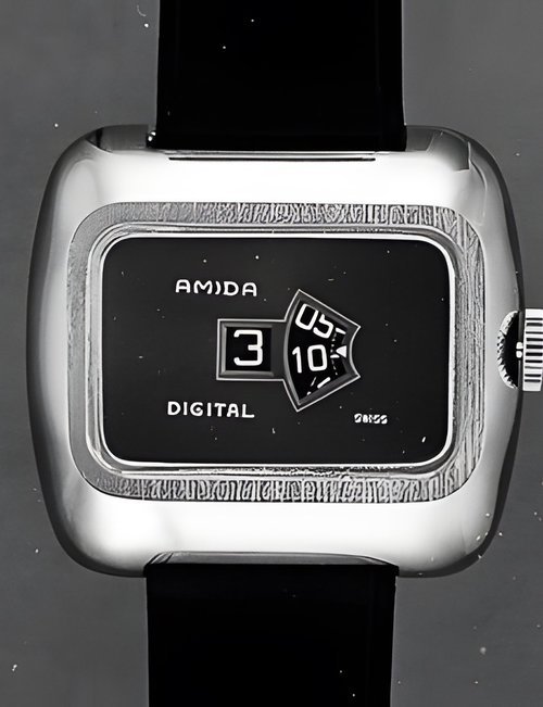 The hour and minute figures are displayed in the apertures placed at the centre of the dial (AMIDA - patented, registered model)