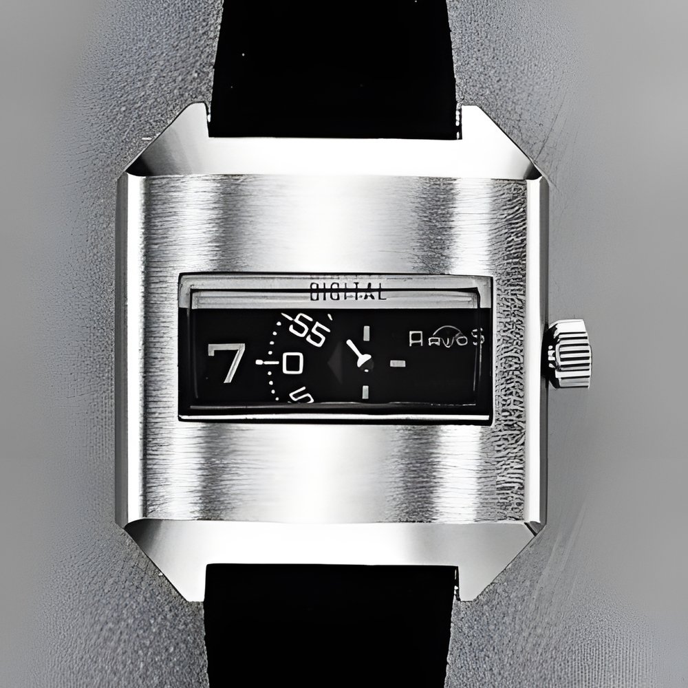 Mechanical digital display models are definitely the rage in the economical watch field. This model is notable for its slim “dial” aperture with its tiny second hand in the centre. Water-resistant chromium or gilt case. Shock-protection. Also available with automatic movement. (ARIOS “Digital”)