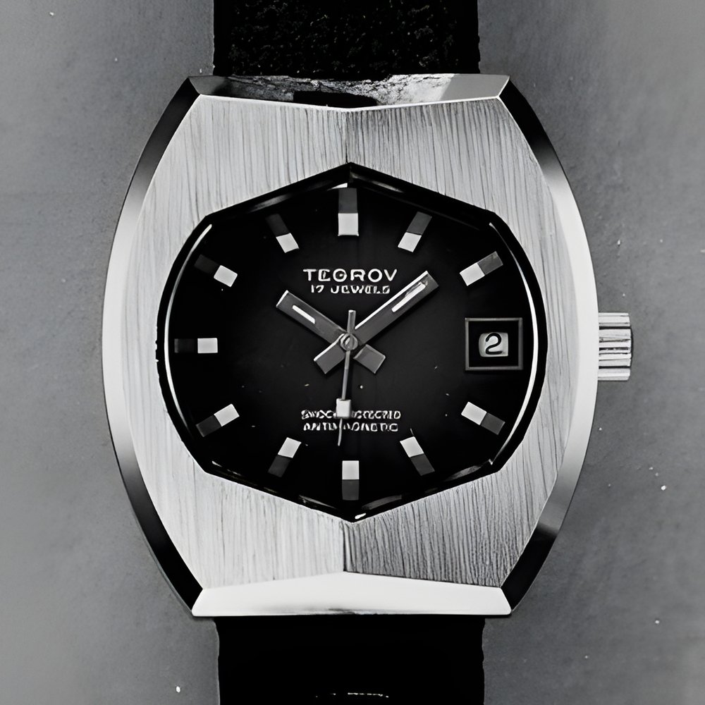 An economical watch with decidedly original styling. Cambered rectangle “tonneau” lines, buffed and brushed chromed finish, steel back. It is water-resistant, shock-protected and equipped with a calendar. The gray dial has silvered hour markers. (SCHAUB-TEGROV)