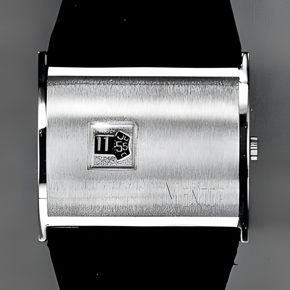 A digital display watch with stunningly daring styling The hours and minutes appear through apertures in an all-metal gilt or chromed case, with brush-finished surface and contrasting glosspolished sides. (BADER-MENTOR)