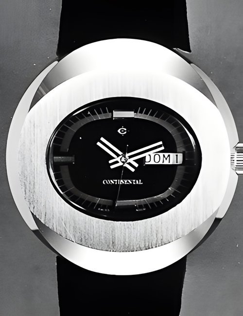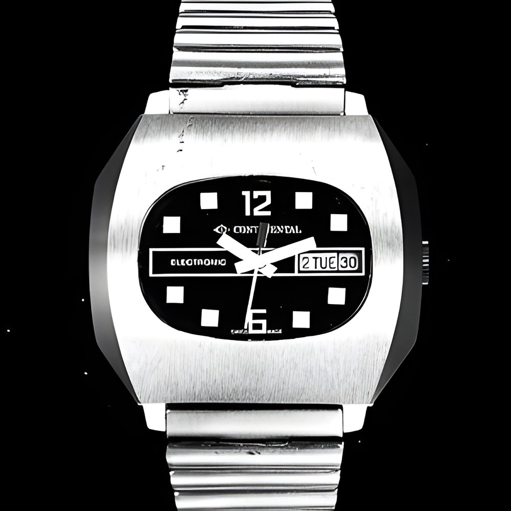 A new economical model with strong and bold styling a balancewheel electronic watch. Profectus case water-resistant to 3 atmospheres, day and date calendar. The battery can be changed by the wearer himself. Accurate to 99.98 , i.e. a maximum rate variation of one minute per week Ø. (CONTINENTAL-electronic)