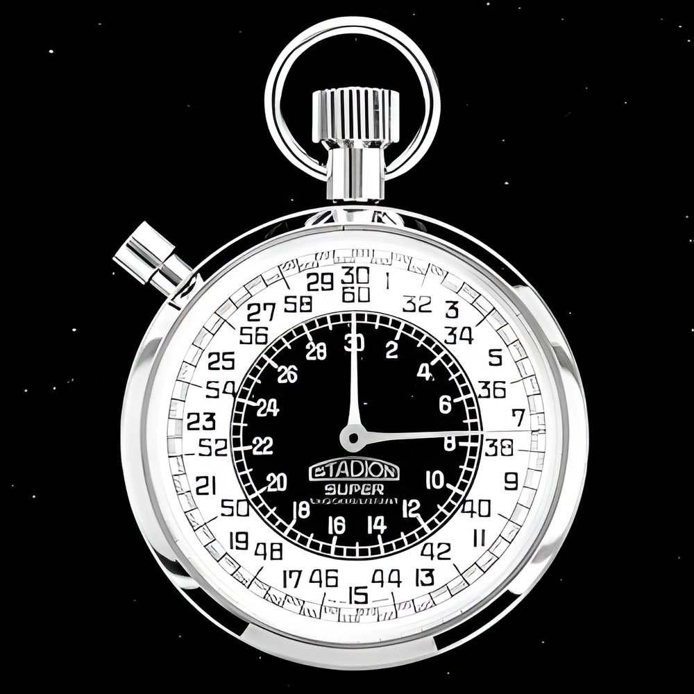 Sports timers are ideal for short-time measurements. Economical models are available, such as this one whose second hand makes one revolution every 30 seconds Precise dial divisions for readings to the tenth of a second. With centre minute register (30’) (ILONA-STADION)