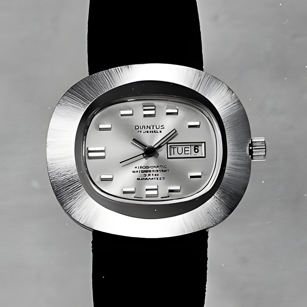 A very trendy “economical” watch. Large, rounded "sunrayt’ brushed bezel with elliptical aperture revealing a modern dial with facetted hour markers. Day and date calendar. The case is waterproof-tested to 3 atmospheres. (DIANTUS)