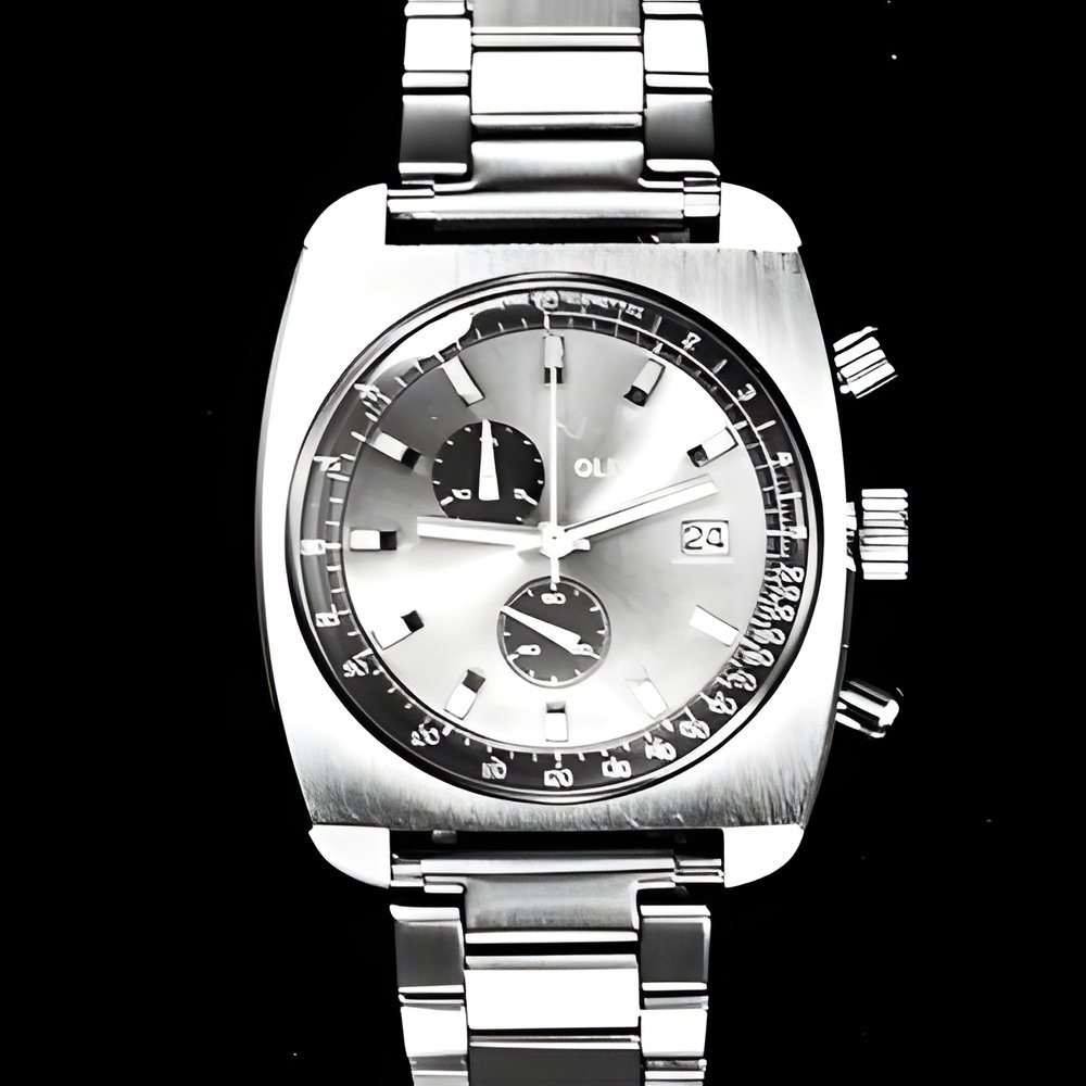 Chronographs are presently enjoying very great popularity in the economical watch field. This model has a centre second hand and a minute register (up to 60 minutes) for short-time measurements It is also equipped with a telemeter scale and a calendar. (VIATOR-OLIVIA)