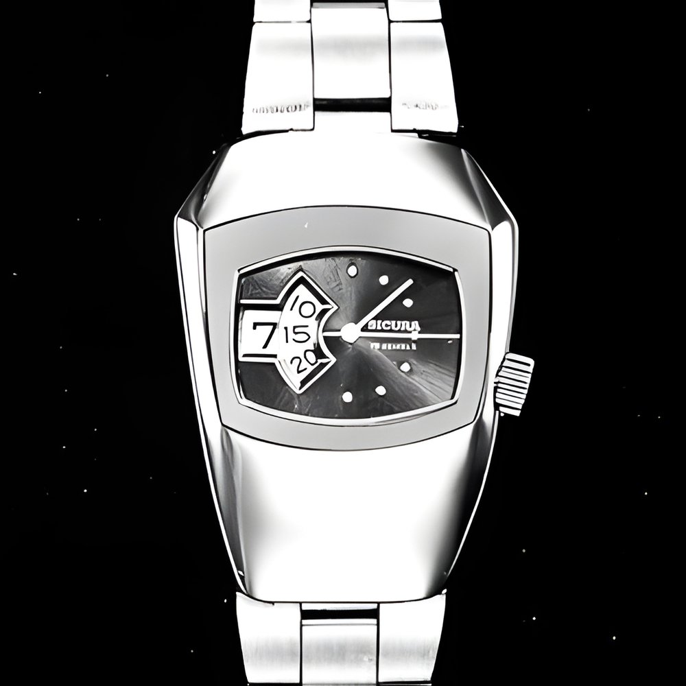 A very trendy digital watch for ladies, with flowing case lines hugging the wrist. Easy-to-read apertures and centre-positioned second hand. An economical model for every purse. (SICURA “Brava”)